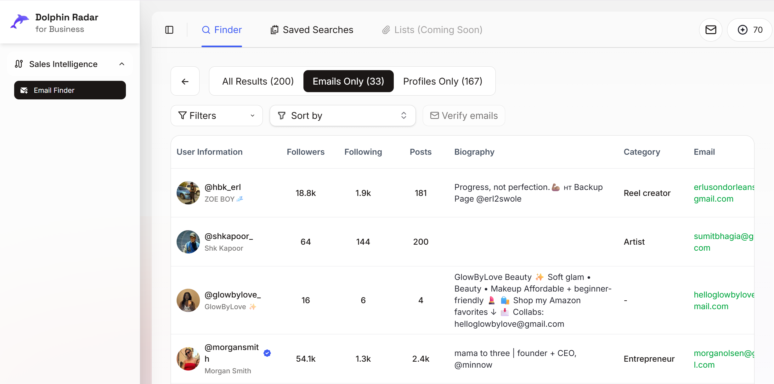 Business Dolphin Radar identifies Instagram accounts based on defined criteria and surfaces publicly available business email addresses in a repeatable workflow.