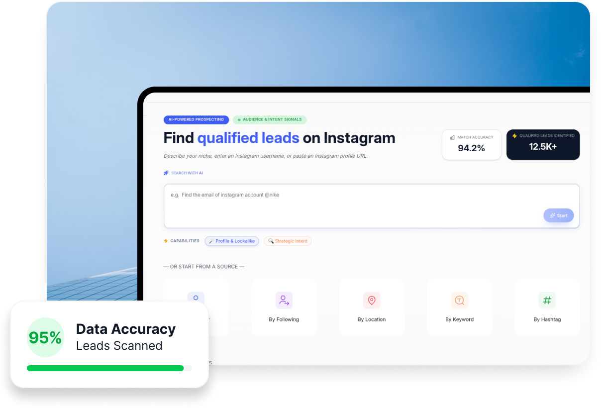 Sales teams choose us because we turn public Instagram activity into clean, usable lead lists fast: multi-source discovery (keywords, hashtags, locations, audiences), intent-style signals to prioritize high-fit accounts, verified email leads to improve contact coverage, and standardized, deduped lists that stay consistent across reps.